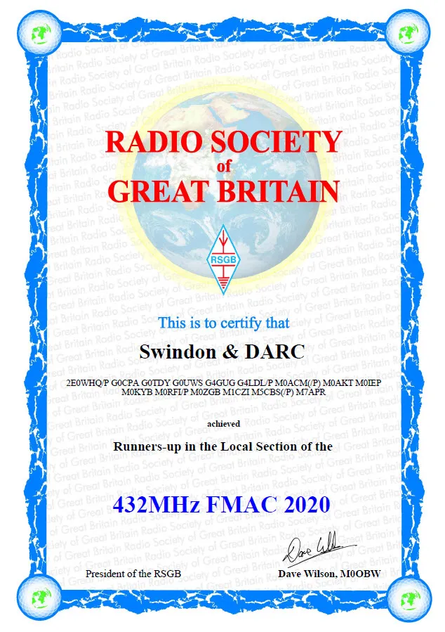 Congratulations to all the members of the club who took part in the RSGB 144Mhz and 432Mhz FMAC contests this year. The results have just been released and the club has achieved an outstanding 2nd place in both the 144Mhz and 432Mhz FMAC contests this year.
