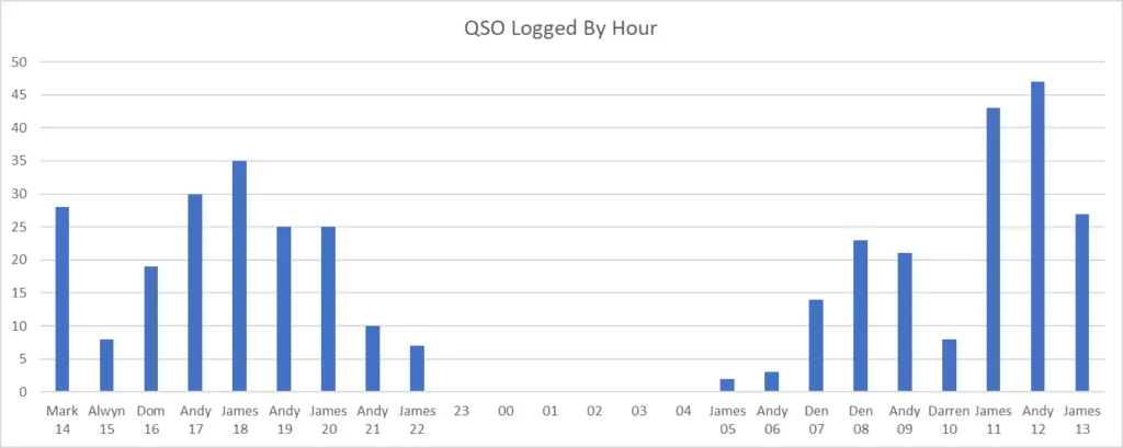 The club entered a multi-op entry as M4W whilst Andy (M1G) and James (M1N) entered single op entries. As in previous years, there was a battle between Andy and James to see who could score the most points. Given both were using the same hardware and software, it came down to operator style, operating slots and a little luck. At the end of the contest, they both had the same number of mults and a QSO count separated by 4. With raw totals, Andy pipped James. Let’s see if it changes after adjudication.